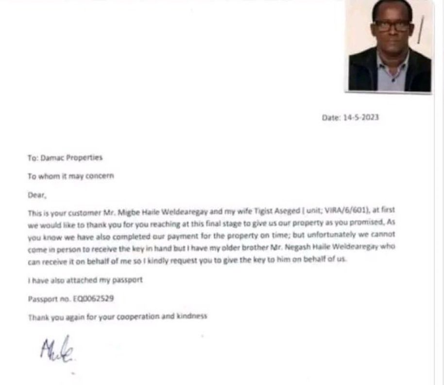 Yet, Megbey exploited the history of Aksum to advance his war rhetoric and evade responsibility for using stolen gold to enrich himself. He has been forcing farmers from their land in northwest Tigray to extract gold for his own gain, polluting and damaging the environment with harmful chemicals that kill animals and render the land unusable for farming for many generations. Megbey claimed he was a businessman before the genocidal war. While he may be a businessman, the property he purchased in Dubai in 2023 was funded with gold illegally mined in Tigray under his command in the North-West (see the letter below).